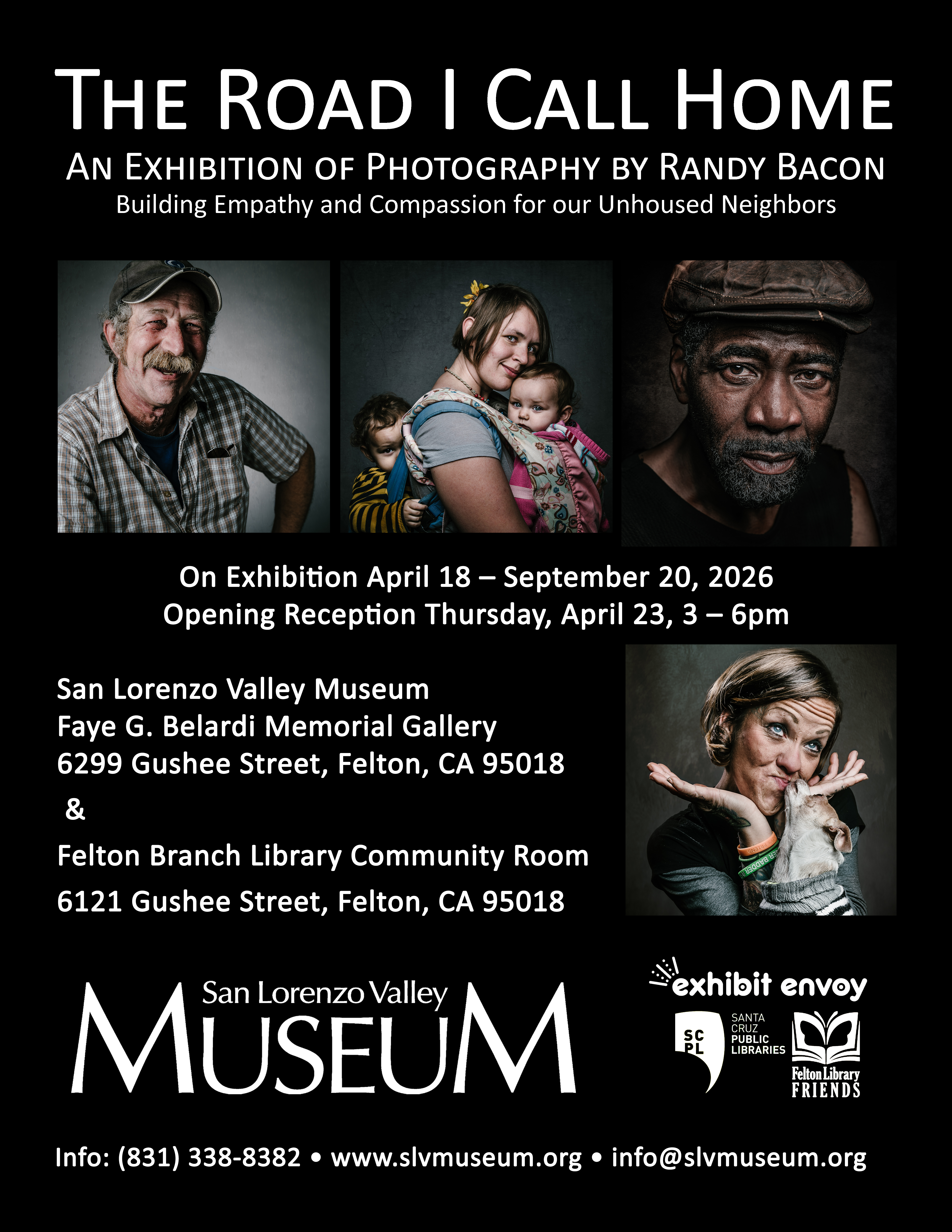 This exhibition features the work of renowned humanitarian and award-winning photographer Randy Bacon. It documents the stories of 32 people experiencing homelessness to build empathy and compassion for the unhoused community. The photographic portraits reveal the beauty, dignity, and identity of each person.